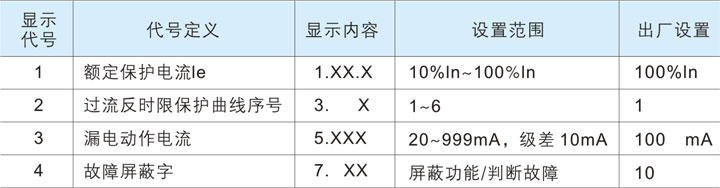 額定動作電流值可在上表中"額定保護電流le設(shè)置范圍"內(nèi)任意設(shè)置。