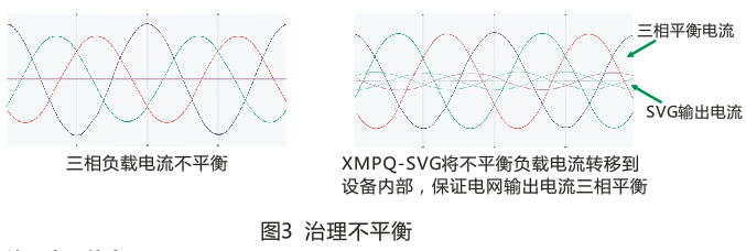 有源濾波器(APF)補償2-50次諧波,靜止無功發(fā)生器(SVG)補償無功、三相電流不平衡、以及13次以內(nèi)低次諧波。