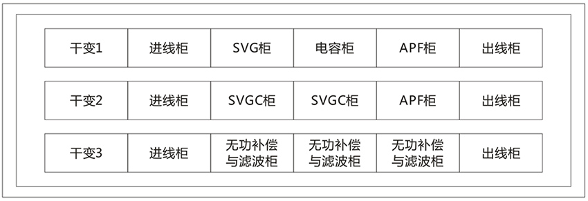 1、干變1號,由APF補償諧波,電容柜補償無功,SVG柜補償剩余無功與不平衡。