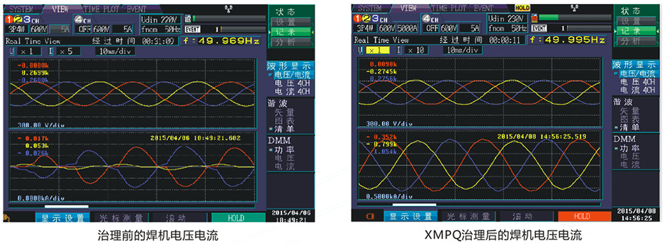 加裝XMPQAPF后,對電流諧波以及無功進(jìn)行治理,效果對比如下,三相電流不平衡基本消失,中線電流基本為零,電壓電流諧波基本消失,THDi降低到2.7%,功率因數(shù)提高到0.980。